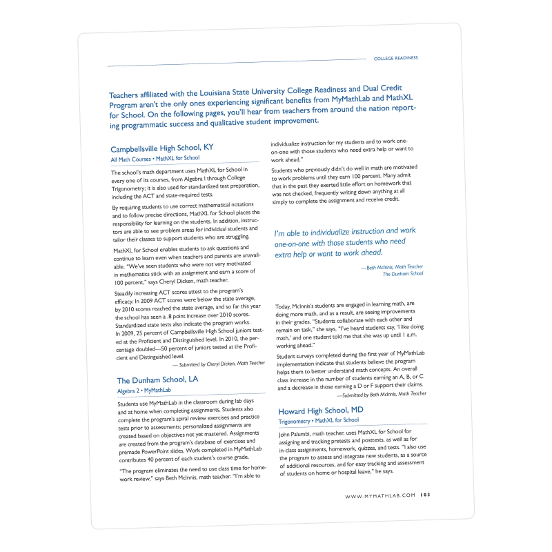 Teachers across the U.S. attribute programmatic success and improvement to MyMathLab for School and MathXL for School