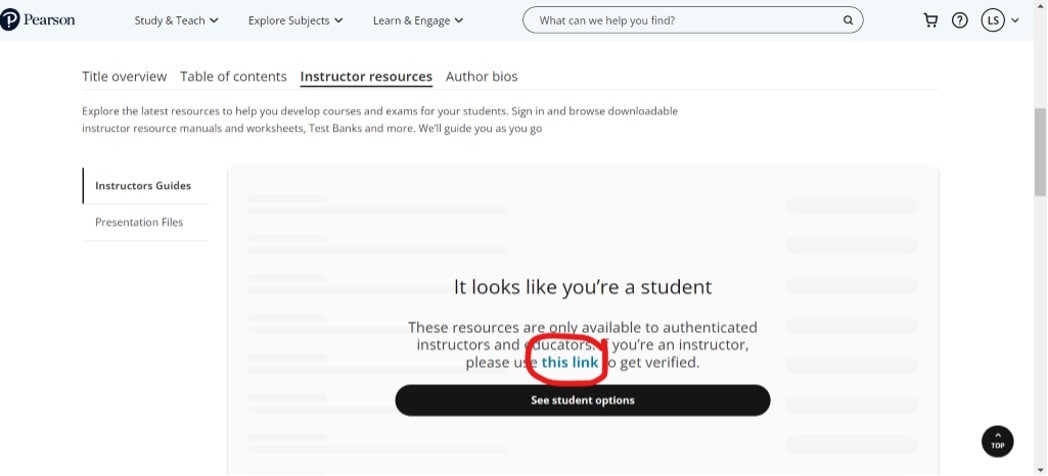 Created an Educator account, but the website still thinks you’re a student? Visit the page for any title, select “I’m an Educator” and navigate to the “Instructor Resources” section below – clicking the link to get verified, as illustrated below: