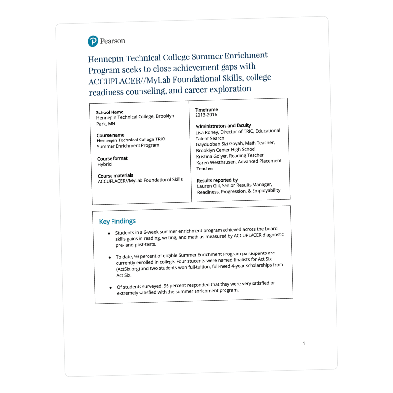 In a pilot program, Hennepin Technical College used Pearson courseware to improve foundational skills over a 6-week summer enrichment program. Students showed notable skills improvement and 96% of them said they were very satisfied with the program.
