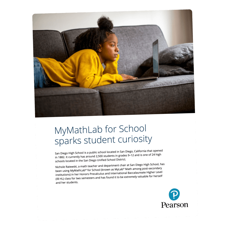 San Diego High School uses MyMathLab in Honors Precalculus and IB classes, finding it helpful in building confidence among students. With a range of features useful to both students and teachers, they’ve noticed increased curiosity and more informed questions about the subject matter. Students are more engaged compared to textbook-only learning methods.